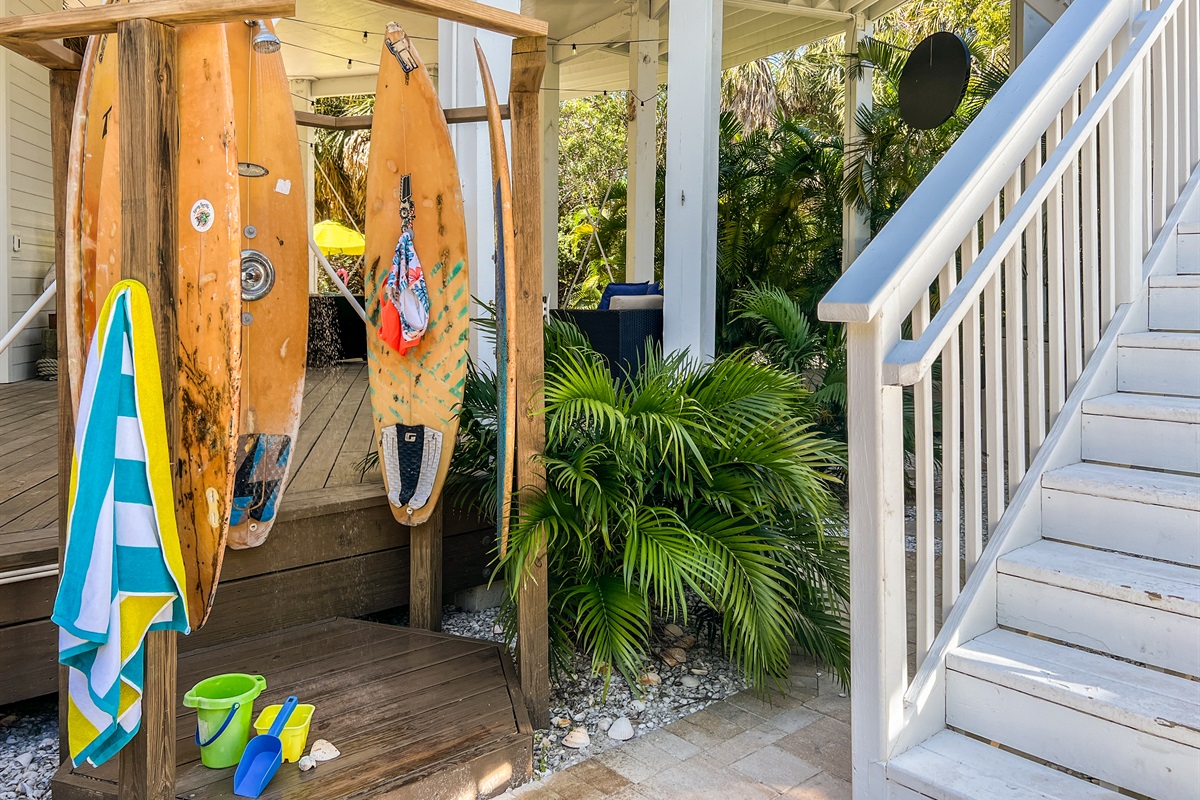 GROUND LEVEL LIVING SPACE: Ready to be wowed? Tucked under the stilted (20 feet) house, you and your friends/family will enjoy a beautifully private, outdoor living space. Large circular sectional, dining table seats 10 comfortably, 3 colorful hammocks over a giant sandbox, Bamboo Bar - swing seating, beverage cooler, a flat screen TV.